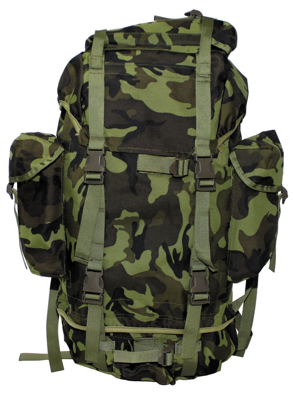 BW polní ruksak v designu CZ tarn, modulární. Batoh s hliníkovou výztuhou má polstrované zádové popruhy, dvě vnitřní kapsy, dvě velké postranní kapsy, velká samostatná přihrádka ve spodní části a víko s kapsou na suchý zip a možnosti připojení na další pytel, Upínací pásy na přední straně, dno a víko, šikovné plastové spony. Hmotnost do 65 litrů, materiál: 100% polyester.