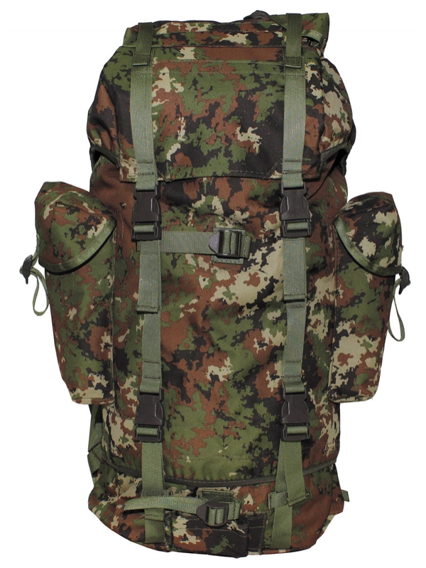 BW bojové balení v designu vegetato, velké. Batoh s hliníkovou výztuhou má polstrované zádové popruhy, dvě vnitřní kapsy, dvě velké postranní kapsy, jedna velká samostatná přihrádka ve spodní části a víko s kapsou na suchý zip a připojení na další pytel, Upínací pásy na přední straně, dno a víko, šikovné plastové spony, obsah do 65 litrů, materiál: 100% polyester.