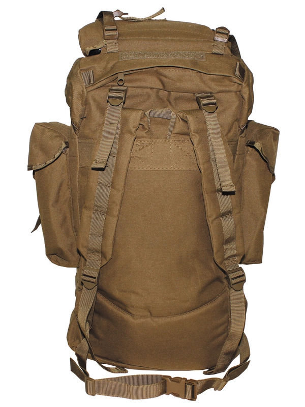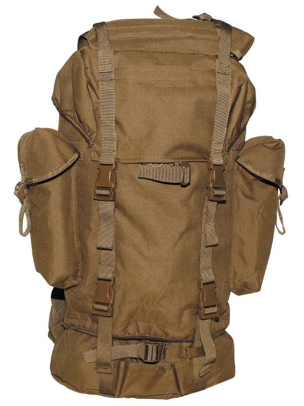 Vysoký bojový ruksak v barevném designu coyote tan s hliníkovou výztuhou, polstrované zádové popruhy, dvě vnitřní kapsy, dvě velké postranní kapsy, velká samostatná přihrádka ve spodní části a víko s kapsou na suchý zip a připojený další pytel, upínací pásy na přední straně, dno a víko, šikovné plastové spony do 65 litrů, materiál: 100% polyester.