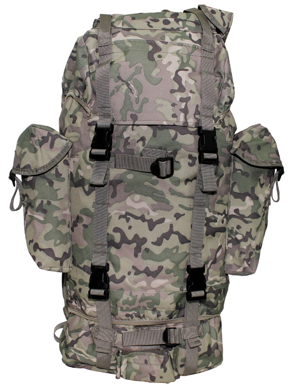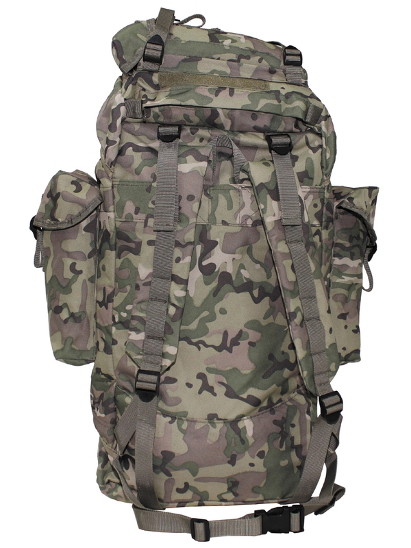 BW Malá polní, velký modulání batoh s hliníkovou výztuží, polstrované zadní popruhy, dvě vnitřní kapsy, dvě velké boční kapsy, velká samostatná přihrádka ve spodní části, kryt s kapsou na suchý zip a pro připojení pro další pytel, upínací pásy na přední straně, spodní straně a víku, praktické plastové druky, obsah: asi 65 litrů, materiál: 100% polyester.