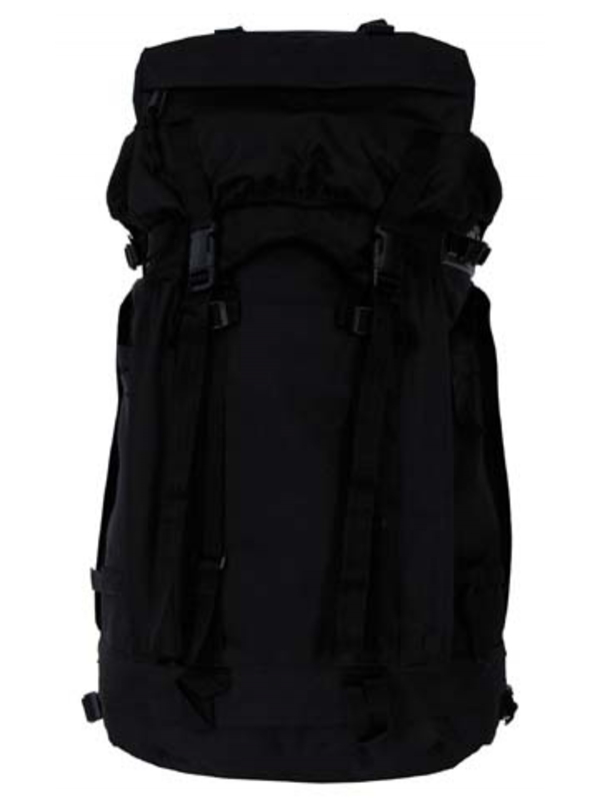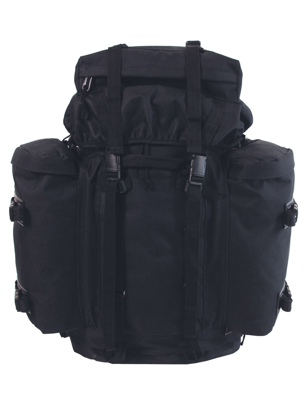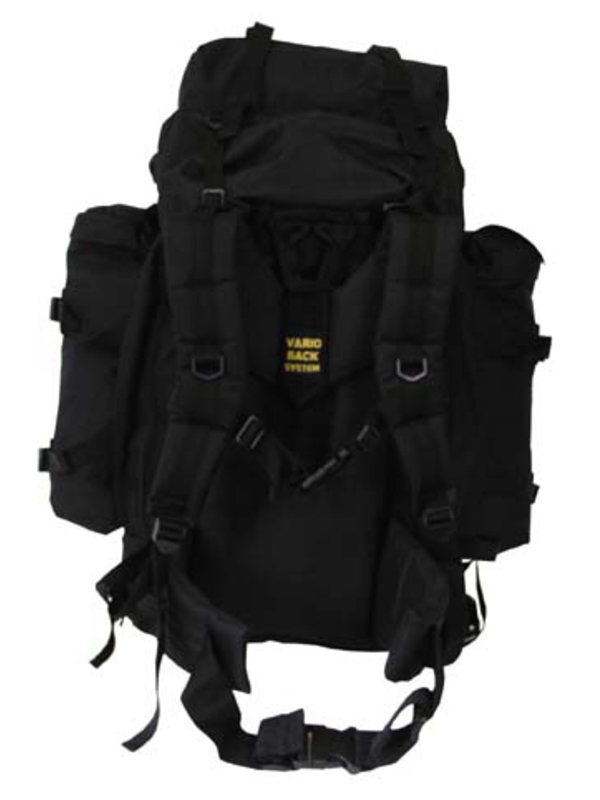 BW batoh "Mountain", v černé barvě, má dvě odnímatelné boční kapsy možné použít následně jako batůžek, ve spodní části prostor na uložení špinavého oblečení, bederní pás a záda jsou polstrovaná a nastavitelný polstrovaný ramenní popruh -VARIO-BACK SYSTEM. Nahoře je prostor uzavřený na zip a kompresní popruhy, různé smyčky na boční kapsy, hrudní popruh, v zadní části je integrovaný kovový rám, kapacita asi 80 l, materiál: 100% polyester, velikost: 38 x 22 batoh x 70 cm, boční kapsy 20 x 10 x 40 cm.