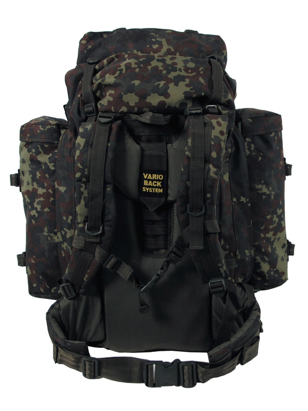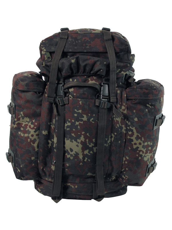 BW batoh "Mountain", v designu flecktarn, má dvě odnímatelné boční kapsy možné použít následně jako batůžek, ve spodní části prostor na uložení špinavého oblečení, bederní pás a záda jsou polstrovaná a nastavitelný polstrovaný ramenní popruh -VARIO-BACK SYSTEM. Nahoře je prostor uzavřený na zip a kompresní popruhy, různé smyčky na boční kapsy, hrudní popruh, v zadní části je integrovaný kovový rám, kapacita asi 80 l, materiál: 100% polyester, velikost: 38 x 22 batoh x 70 cm, boční kapsy 20 x 10 x 40 cm.