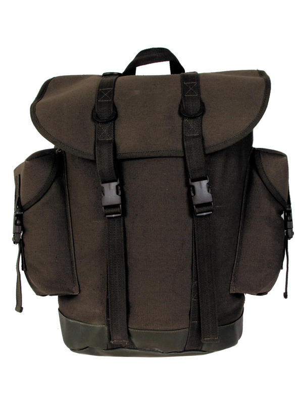 BW horský batoh, malý, v olivové barvě, nový model. Nový styl tradičního horského batohu má plastový uzávěr, ramenní vycpávky, vyztuženou základnu vyrobenou z nepromokavé PVC, 2 boční kapsy, 1 vnitřní kapsu, držadlo, obsah asi 30 litrů, materiál: 100% bavlna.