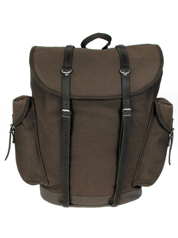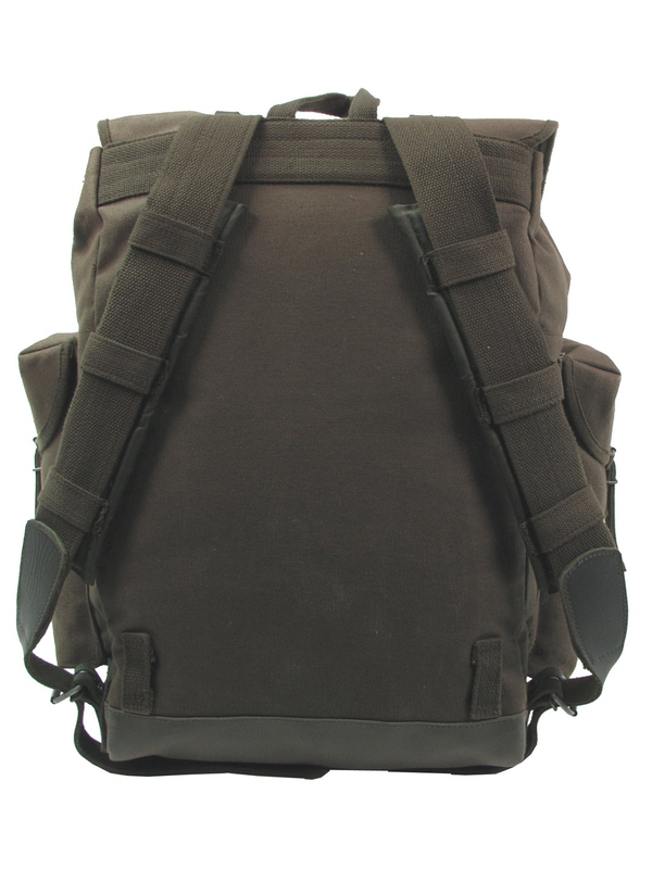 BW horský batoh, retro styl, olivový se zadním čalouněným popruhem, s uchem, dvěma bočníma kapsami a koženými popruhy, obsah asi 30 litrů, materiál: 100% bavlna.