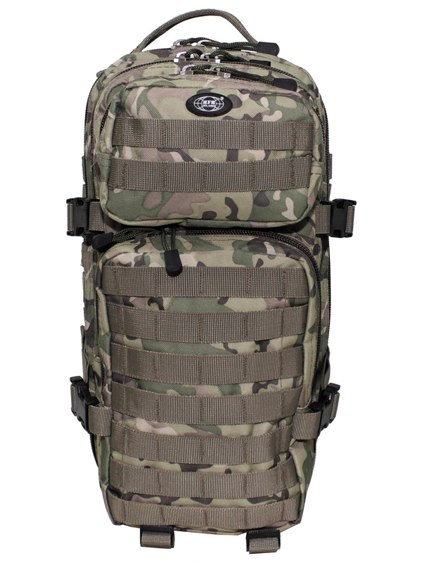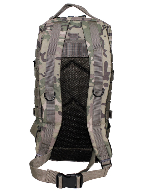 Originál US batoh, Assault I v designu bojové camo, dvě velké hlavní přihrádky na zip a síťované kapsy, dvě velké přední kapsy se zapínáním na zip, nastavitelné a polstrované ramenní popruhy s D-kroužky, vestavěnou kapsou na suchý zip pro balení hydro na zadní straně, různé Molle připojovací body, držadlo, prodyšná záda, obsah 30 l , materiál: 100% bavlna, velikost: 45 x 25 x 20 cm.