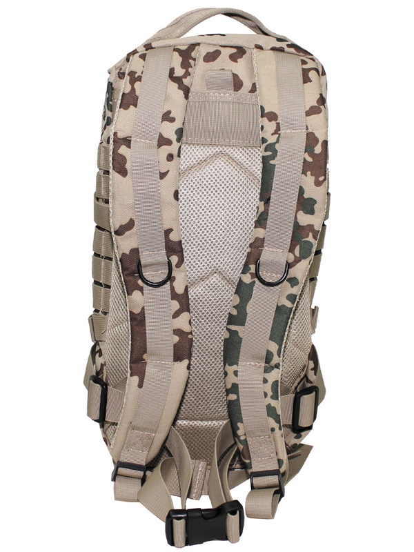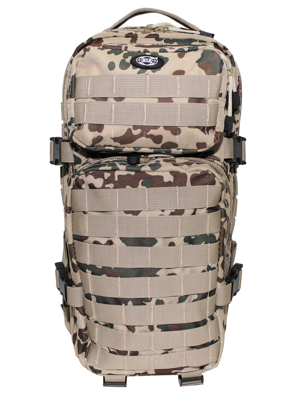 US batoh ASSAULT I, v barevném designu bw tropentarn. "Malá polní" je voděodolný batoh na 30 l balení útoku, má dva velké prostory s různými zipi a síťovinami uvnitř a dvě malé přední kapsy, vestavěnou kapsu na suchý zip pro vodní balení. Všechny prostory jsou uzavřeny robustními dvoupásmovými zipy. Ergonomicky tvarované ramenní popruhy jsou polstrované, asi 5 cm široké s nastavitelnou délkou, kromě toho má batoh polstrovaná záda a nastavitelný popruh kolem pasu s klipem. Batoh umožňuje ovládání velikosti a díky fixaci zavazadel řadou bočních kompresních popruhů dává možnost připojení dalšího příslušenství. Nylonové popruhy MOLLE jsou všestranné díky smyčkám a D-kroužkům. Batoh tak nabízí velké množství prostoru a je tak ideální pro vojenské účely, ale i táboření a turistiku. Kapacita: 30 l. Materiál: 600D polyester, PVC potažené, rozměry: cca. 42 x 20 x 25 cm, hmotnost: 1100 g.