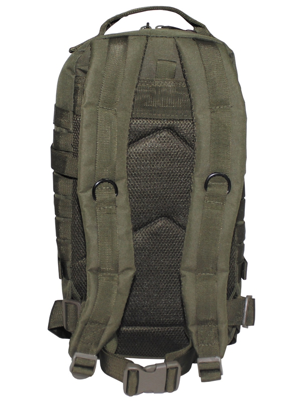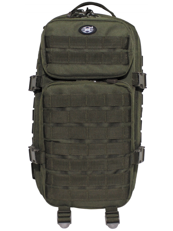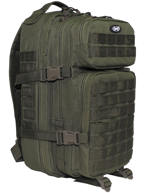 US batoh Assault I, v olivové barvě má dvě velké hlavní přihrádky na zip a síťované kapsy, dvě velké přední kapsy na zip, nastavitelné a polstrované ramenní popruhy s D-kroužky, vestavěnou kapsu na suchý zip kapsa na hydro-batoh na záda, různé Molle úchyty, držadlo, prodyšná záda a ramenní popruhy, obsah asi 30 litrů , materiál 100% nylon, velikost: 45 x 25 x 20 cm.