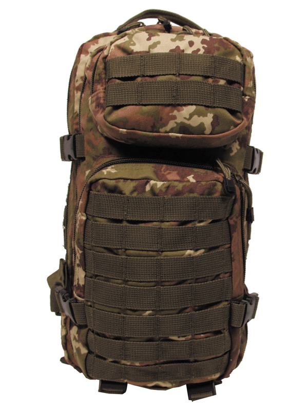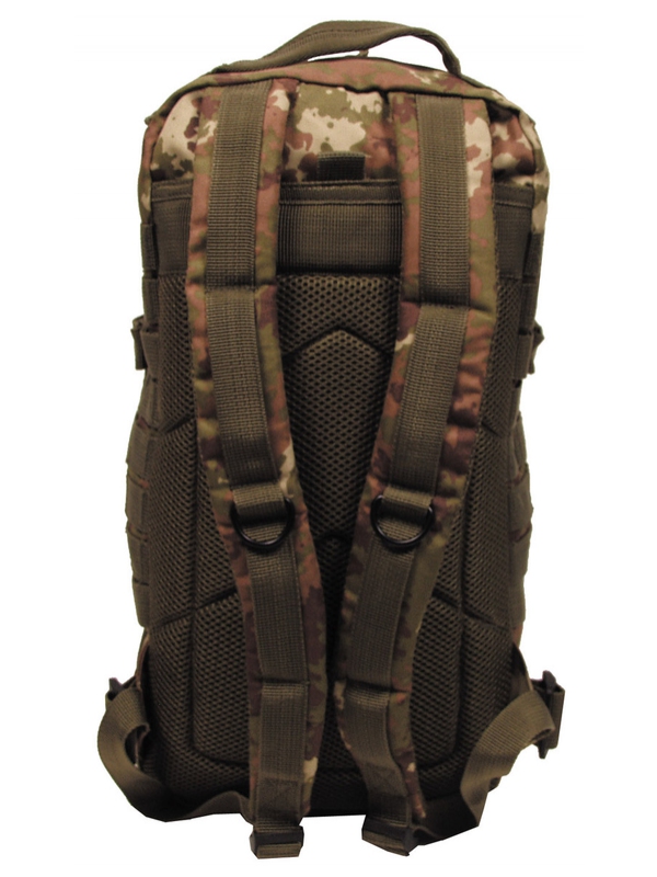 US batoh Assault I, v designu vegetato, má dvě velké hlavní přihrádky na zip a síťované kapsy, dvě velké přední kapsy na zip, nastavitelné a polstrované ramenní popruhy s D-kroužky, vestavěnou kapsu na suchý zip kapsa na hydro-batoh na záda, různé Molle úchyty, držadlo, prodyšná záda a ramenní popruhy, obsah asi 30 litrů , materiál 100% nylon, velikost: 45 x 25 x 20 cm.
