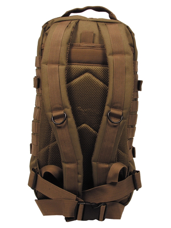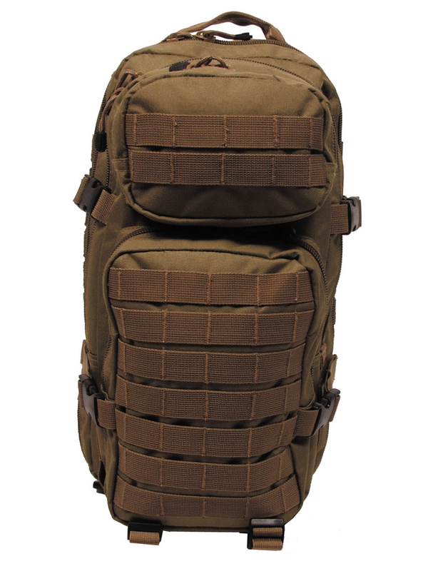 US batoh Assault I, v designu coyote tan, má dvě velké hlavní přihrádky na zip a síťované kapsy, dvě velké přední kapsy na zip, nastavitelné a polstrované ramenní popruhy s D-kroužky, vestavěnou kapsu na suchý zip kapsa na hydro-batoh na záda, různé Molle úchyty, držadlo, prodyšná záda a ramenní popruhy, obsah asi 30 litrů , materiál 100% nylon, velikost: 45 x 25 x 20 cm.