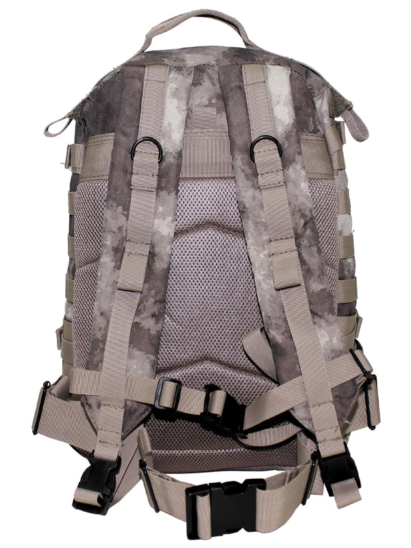 Batoh má velkou hlavní přihrádku na zip a síťovanou kapsu, dvě velké přední kapsy na zip, polstrované a nastavitelné ramenní popruhy s D-kroužky, vestavěnou kapsou na suchý zip pro balení hydro na zadní straně, různé Molle připojovací body, nastavitelný břišní pás, odnímatelné držadlo, Velikost: batoh 48 x 30 x 30 cm, materiál: 100% polyester.
