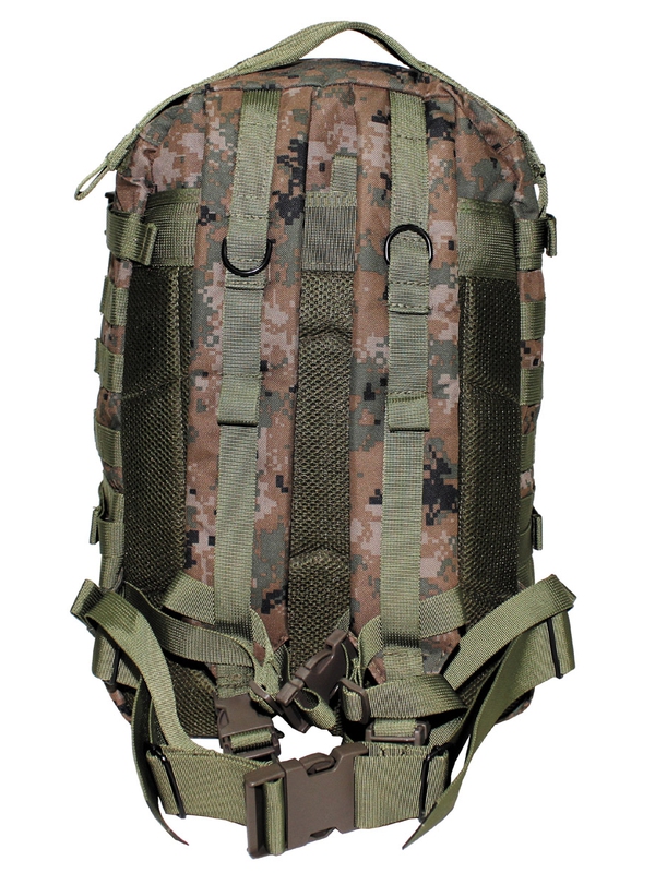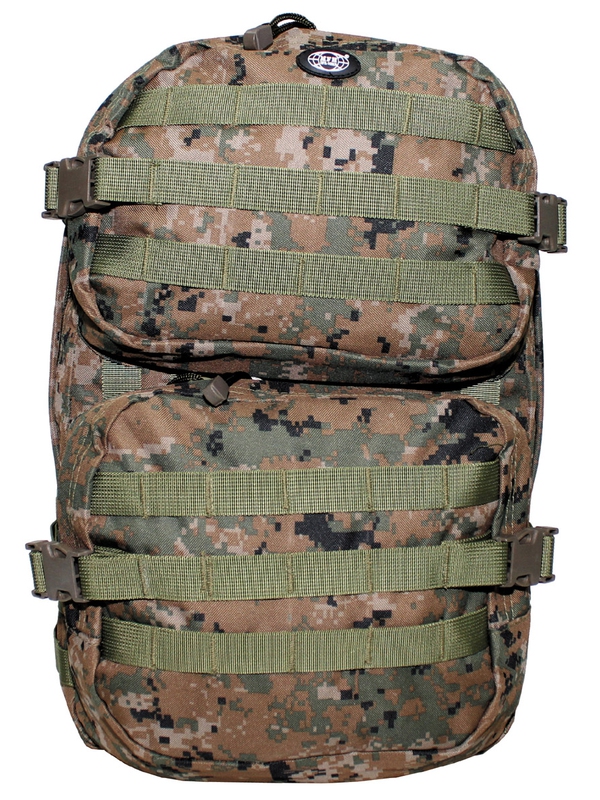 US batoh Assault II v designu digital woodland. Batoh má velkou hlavní kapsu na zip a síťovanou kapsu, dvě velké přední kapsy na zip a nastavitelné polstrované ramenní popruhy s kroužky D-, kapsa na suchý zip integrovaná na vodní batoh na zádech, Molle úchyty, nastavitelný bederní pás a odnímatelné držadlo. Velikost: 48 x 30 x 30 cm, material: 100% nylon.