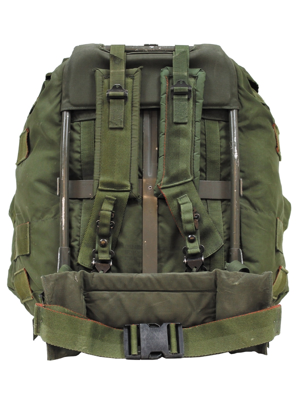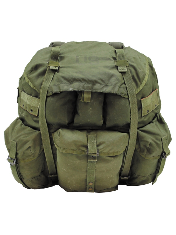 US batoh "Alice Bag" olivový, velký. Kovová nosná kostra, bederní pás a polstrované nosné řemeny. 1 hlavní kaspsa 6 vnějších kapes, Materiál 100% Nylon, Velikost: 66 cm zadní výška, 55 cm široká, 32 cm hloubka. Použitý.