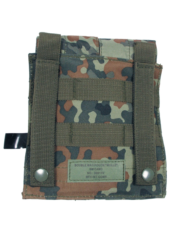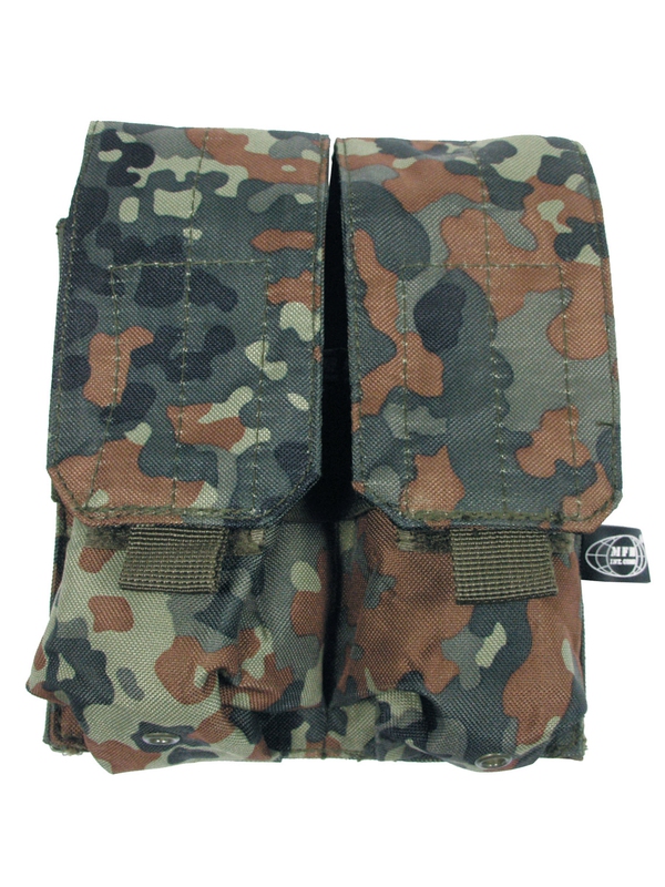 Pouzdro na zásobník ”MOLLE”, Modular System, dvojité, design flecktarn. Dvojité pouzdro na dva zásobníky na suchý zip. Velikost: šÍřka: 8,5 cm, hloubka: 5 cm, výška: 17 cm, materiál: 100% nylon. | ||