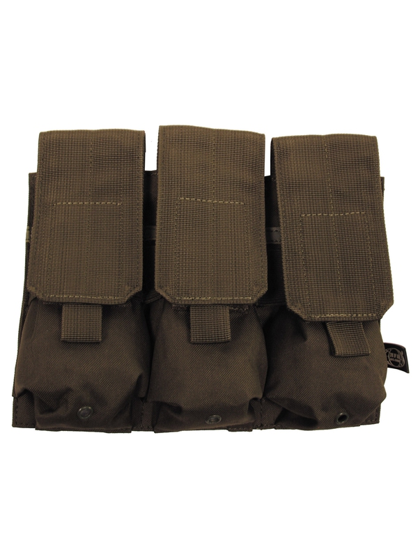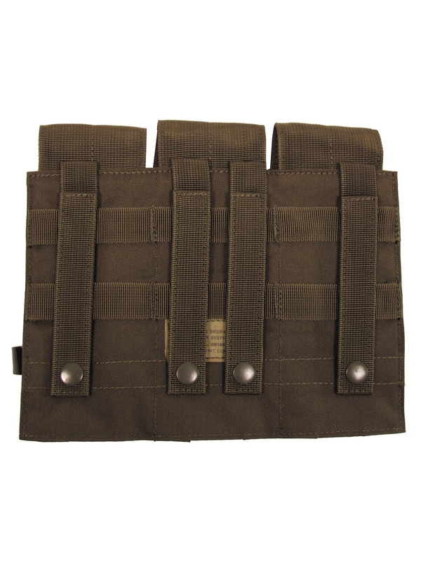 Trojité pouzdro na zásobník "MOLLE" modulární systém, v olivové barvě, tři kapsy na suchý zip, velikost: šířka: 8,5 cm, hloubka: 5 cm, výška: 17 cm, materiál: 100% polyester. | ||
