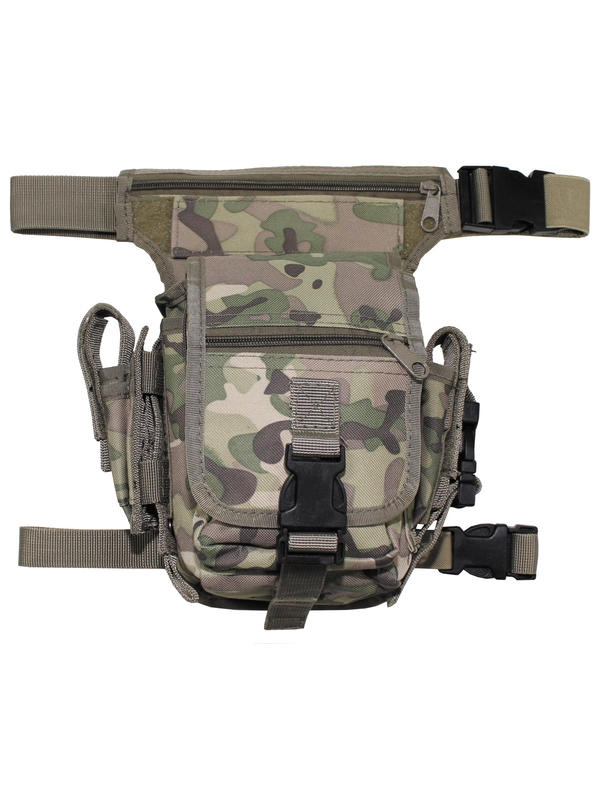 Taška Hip Bag, operační camo, s páskem na nohu a sponou na opasek Praktická taška hip, ideální pro bezpečnostní sektor, volný čas a cestování, odnímatelný boční a stehenní popruh, nastavitelný s klipem na uzavření, možnost připojení deseti různých předmětů, včetně tří se zapínáním na zip a jedna odepínací, na suchý zip odnímatelná deska, materiál: 100% polyester.