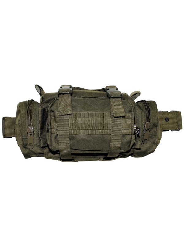 Olivová ledvinka, s nastavitelným popruhem s přezkou na zapnutí, spona na opasek, ucho, sedm různých přihrádek, čtyři na zip, dvě na tužky. Materiál: 100% polyester