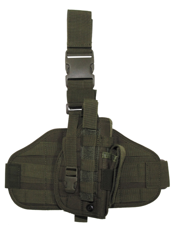 Modulární pouzdro na nohy a opasek Molle v olivové barvě, je praktické stehenní pouzdro s PVC lištou, pouzdrem na zásobník na nastavitelném opasku. Pouzdro je odnímatelné, platforma se třemi řadami PALS je použitelná samostatně a pistole může být v pouzdře jištěna až třemi způsoby najednou (fastex-velcro-kovový druk), kapsa pro jeden pistolový zásobník, ke stehnu a k opasku se přichycuje pomocí snadno rozepnutelné fastexové přezky. Materiál: 100% polyester.