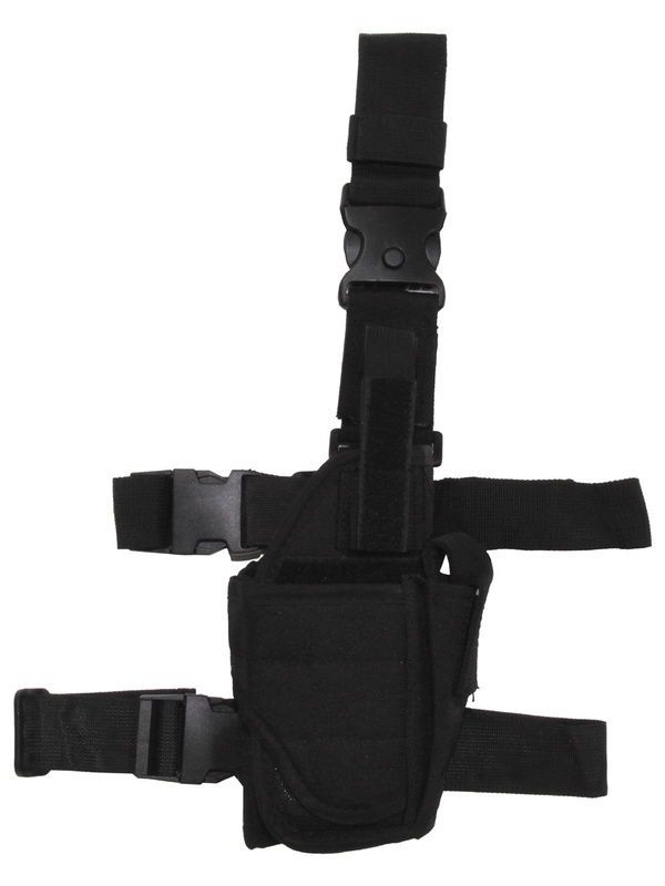 Univerzální nízké pouzdro na pistoli na nohu, pravé, v černé barvě je vhodné pro všechny populární zbraně a individuální velikosti na suchý zip, zabezpečení zbraní v pásku na suchý zip. Pouzdro s uzávěrem na suchý zip, nastavitelný opasek s přezkou a 2 nastavitelné nožní popruhy, materiál: 100% polyester.