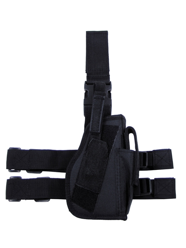 Stehenní pouzdro na pistoli pravé, černé, z odolného materiálu je vhodné pro všechny typy pistolí. Pouzdro se upevňuje pomocí nylonových popruhů k opasku a dvěma popruhy k noze. Odepíná se prostřednictvím plastových spon. Na pouzdře je kapsa pro náhradní zásobník. Rozměry: 19 cm x 13 cm x 5 cm, u některých typů zbraní může hlaveň pouzdro přesahovat. Materiál: 100% nylon.