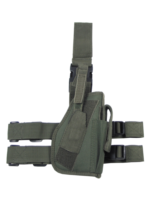 Stehenní pouzdro na pistoli pravé, olivové, z odolného materiálu je vhodné pro všechny typy pistolí. Pouzdro se upevňuje pomocí nylonových popruhů k opasku a dvěma popruhy k noze. Odepíná se prostřednictvím plastových spon. Na pouzdře je kapsa pro náhradní zásobník. Rozměry: 19 cm x 13 cm x 5 cm, u některých typů zbraní může hlaveň pouzdro přesahovat. Materiál: 100% nylon.