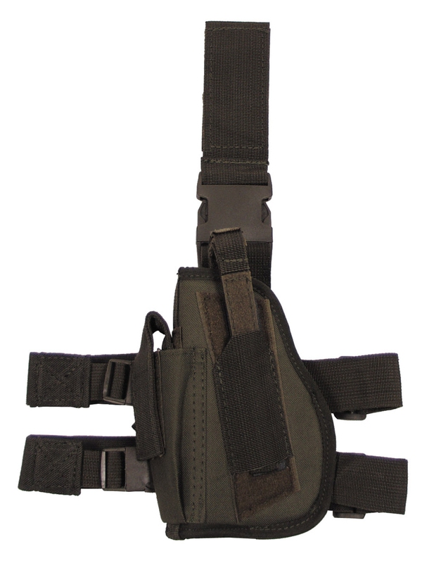 Levé stehenní pouzdro na pistoli z odolného materiálu v olivové barvě, je vhodné pro všechny typy pistolí. Upevňuje se prostřednictvím nylonových popruhů k opasku a k noze - 2 popruhy, odepíná se pomocí plastových spon. Na straně pouzdra je kapsa pro náhradní zásobník. U některých typů může hlaveň pouzdro přesahovat. Materiál: 100% nylon.
