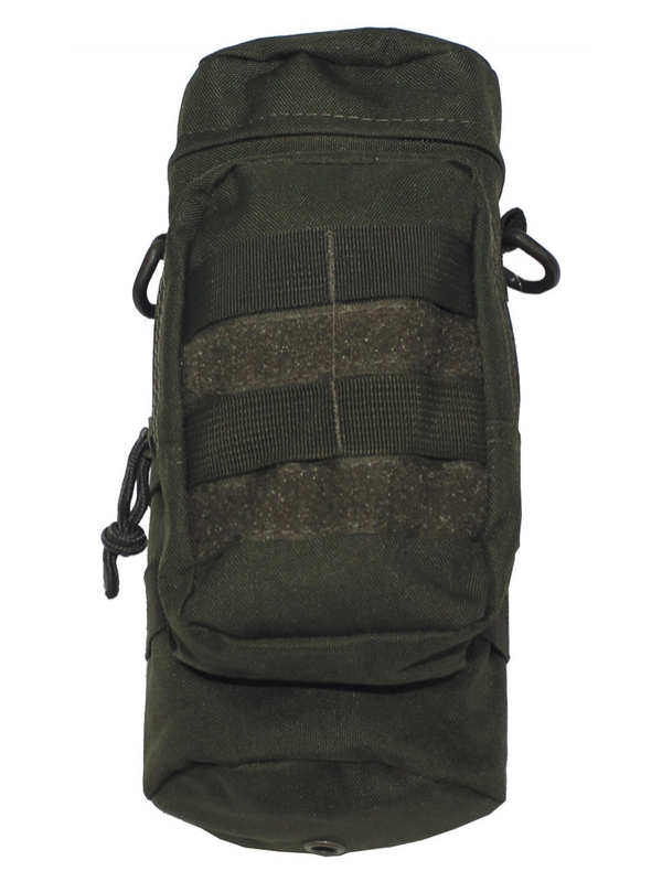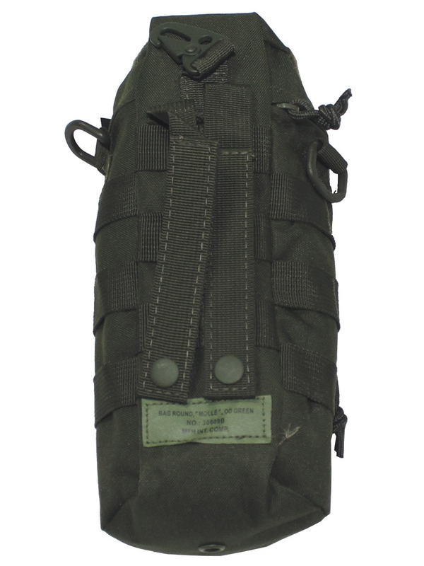 Taška na kolo, "MOLLE", olivová. Vychytaný batoh na kolo má velkou hlavní přihrádku s víkem na zip a přední kapsu na zip a dvě na pásky se suchým zipem, 2 D-kroužky, 1 karabina, Průměr: 11 cm, výška: 25 cm, materiál: 100% polyester.
