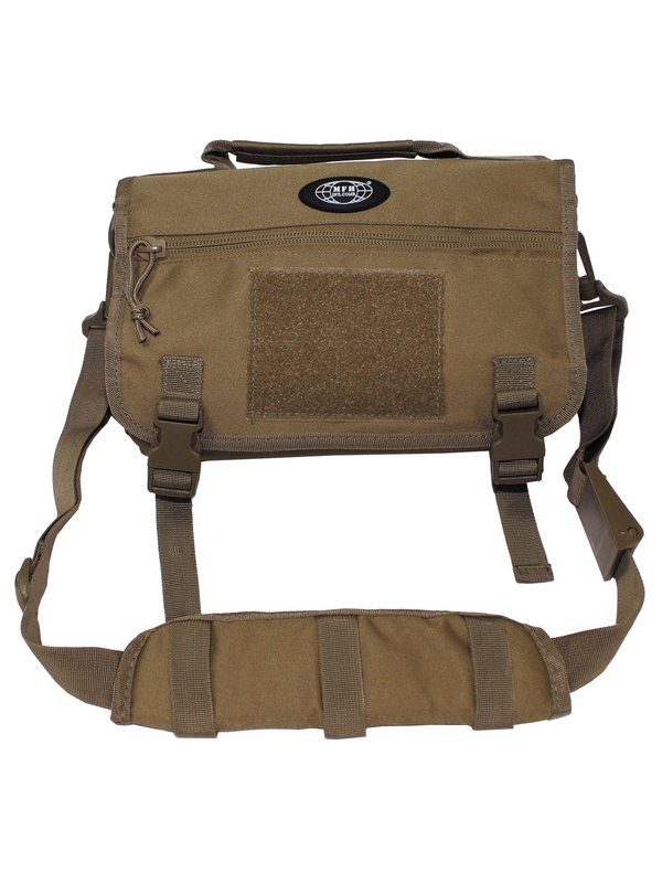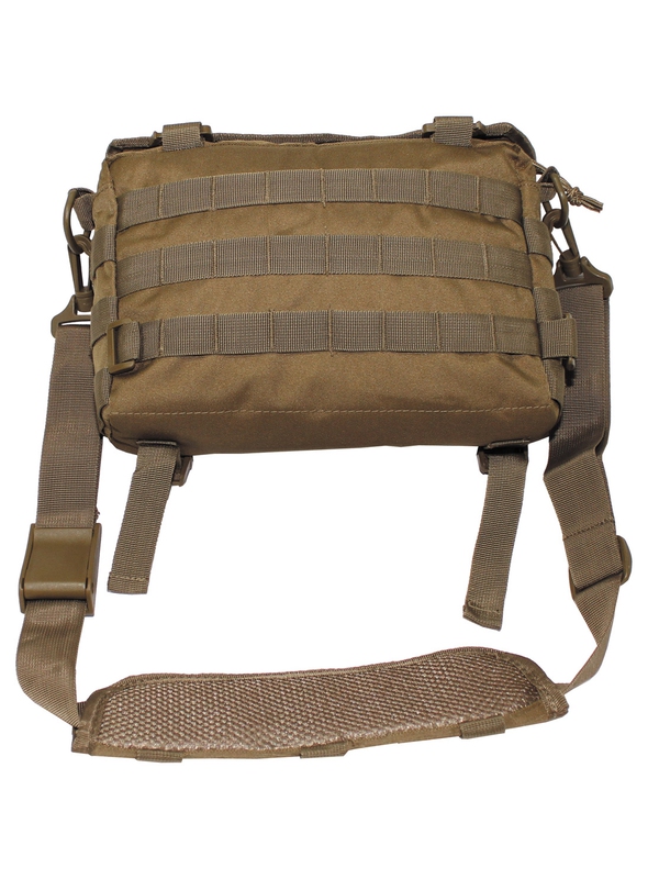 Brašna přes rameno "MOLLE", malá, v barevném provedení coyote tan. Brašna má polstrovanou hlavní kapsu s elastickou výztuží na zachování tvaru, na horní klopě ucho, kapsa na zip na vnější straně, lepítko 12,5 x 10 cm a transparentní kapsa na doklady 28 x 13 cm uvnitř, odnímatelný ramenní popruh s nastavitelnou délkou a s ramenními vycpávkami. Velikost: 28 x 19 x 6,5 cm, materiál: 100% polyester.