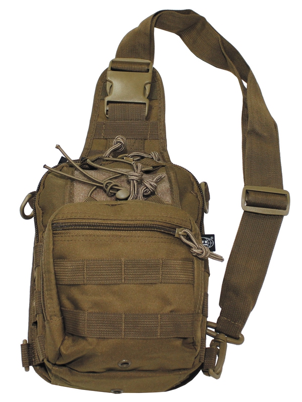 Taška přes rameno Molle v designu coyote tan má velkou hlavní přihrádku s dvěma kapsami uvnitř, přední kapsu s vnitřní kapsou, popruhem a karabinou, velký slot vzadu, držadlo, nastavitelný a odnímatelný ramenní popruh, 4 D-kroužky, lepítko vpředu, materiál: 100% polyester.