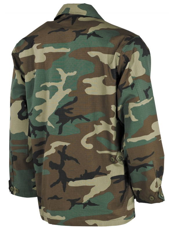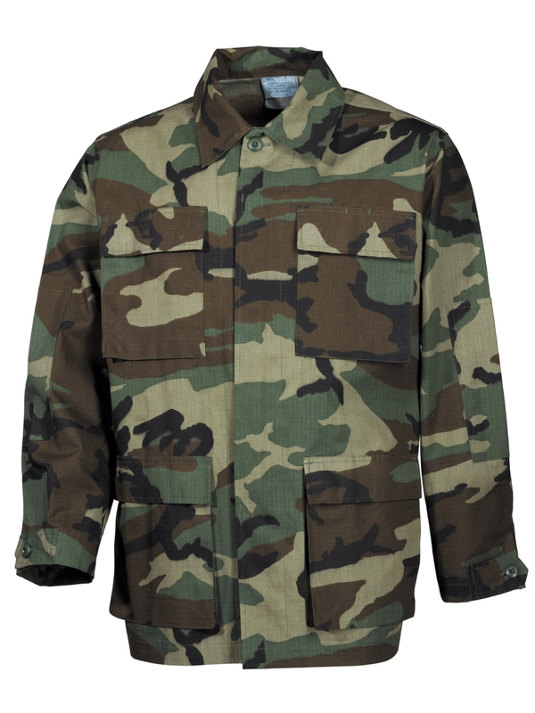 US BDU polní bunda, Rip Stop, v designu woodland. Klasická polní bunda US Army se čtyřmi našitými kapsami, nastavitelným pásem, dvojitými lokty, manžety s nastavitelnými knoflíky, na rukávu kapsa na psací potřeby, materiál: 100% bavlna.