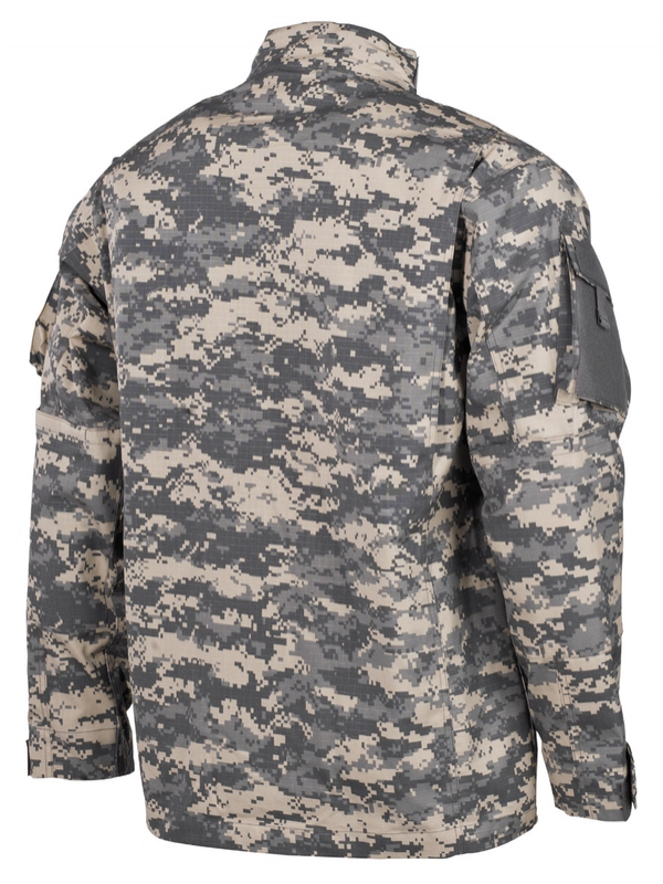 US polní bunda ACU, Rip Stop, v designu AT-digital. Nový základní model legendární bundy US army má dvě šikmé kapsy na hrudi se zapínáním na suchý zip, náloketní náplastí, které se dají rozšířit o polstrování, dvě kapsy na ramenou s odznaky na suchý zip a límec se suchým zipem, vpředu zip na propínání. Materiál: 100% bavlna.