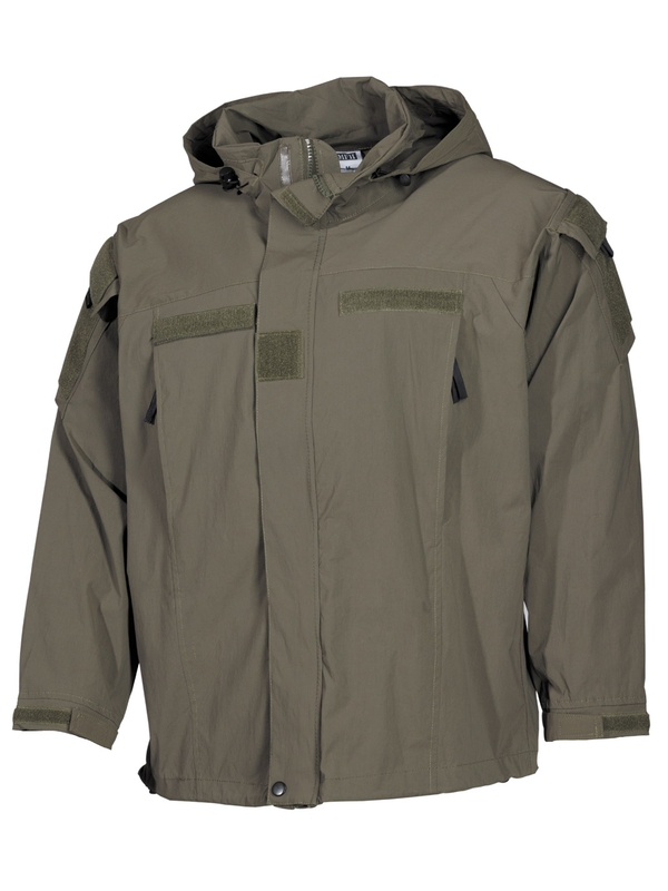 US  softshell bunda, olivová. Nepromoková a větruodolná ochranná bunda PCU je prodyšná s kapsami se suchým zipem na rukávech, nastavitelné manžety se suchým zipem,  dvě kapsy na hrudi na zip, límec s pružnou šňůrkou, v podpaží zip pro větrání,  kapuce integrovaná v límci, přední zip s v kryté liště. Materiál: 98% nylon, 2% spandex.