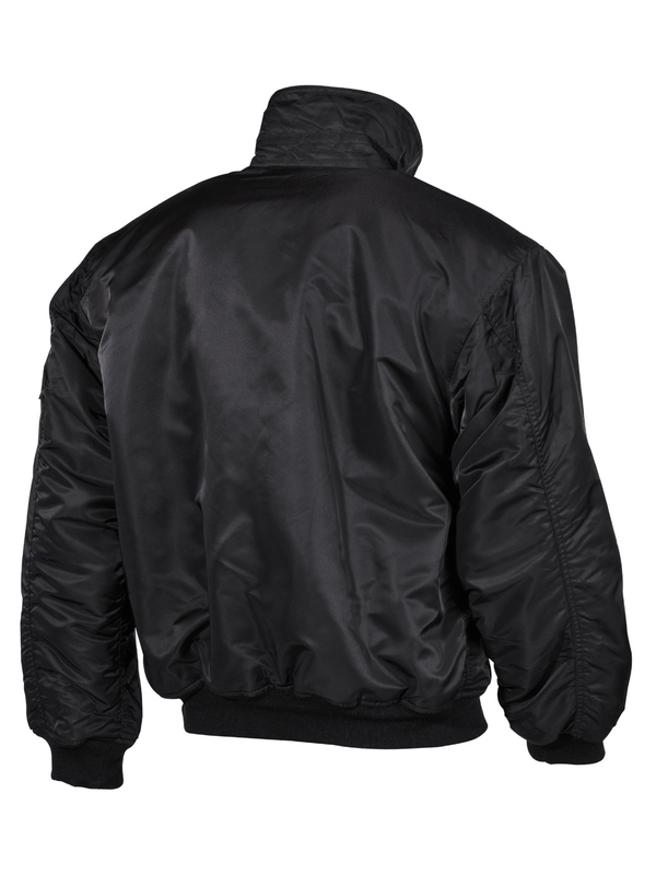 CWU pilotní bunda černá s límcem má dvě našité kapsy, výložky na suchý zip na ramenou, rukávy a pas do pletené manžety. Materiál: 100% nylon, podšívka: 100% polyester, výplň: 100% polyester.