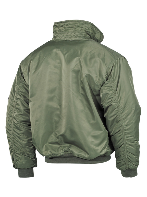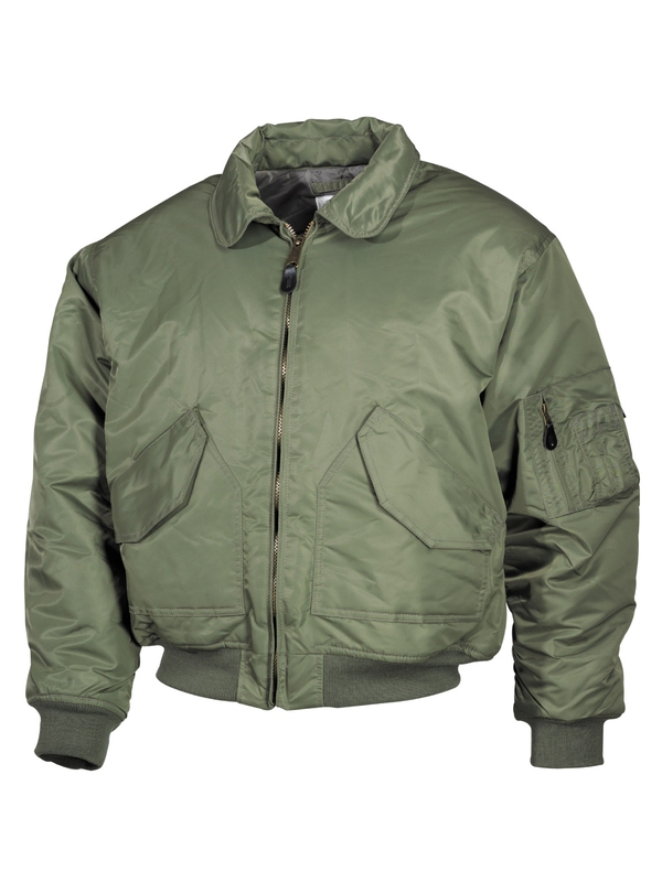 CWU pilotní bunda olivová s límcem má dvě našité kapsy, výložky na suchý zip na ramenou, rukávy a pas do pletené manžety. Materiál: 100% nylon, podšívka: 100% polyester, výplň: 100% polyester.