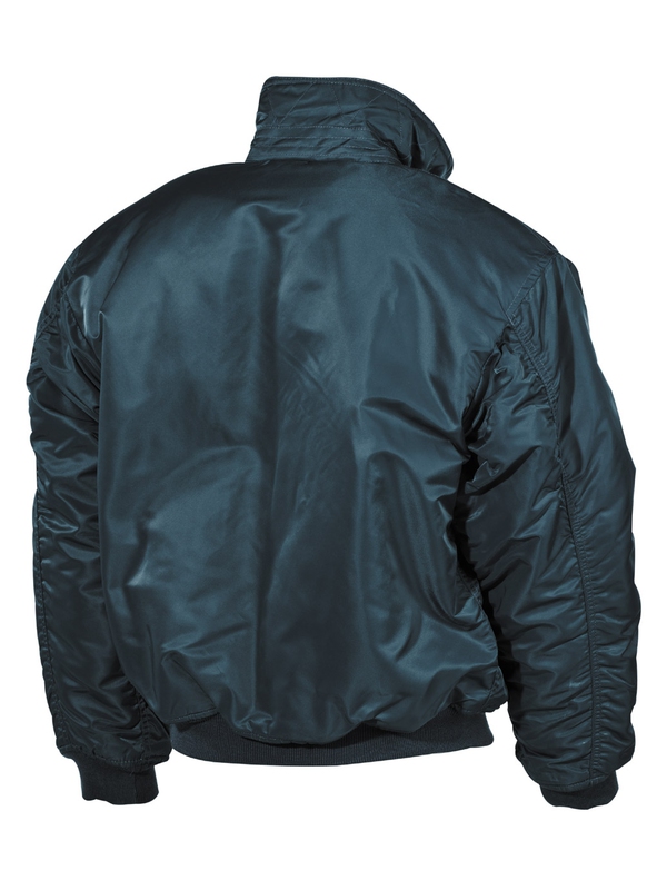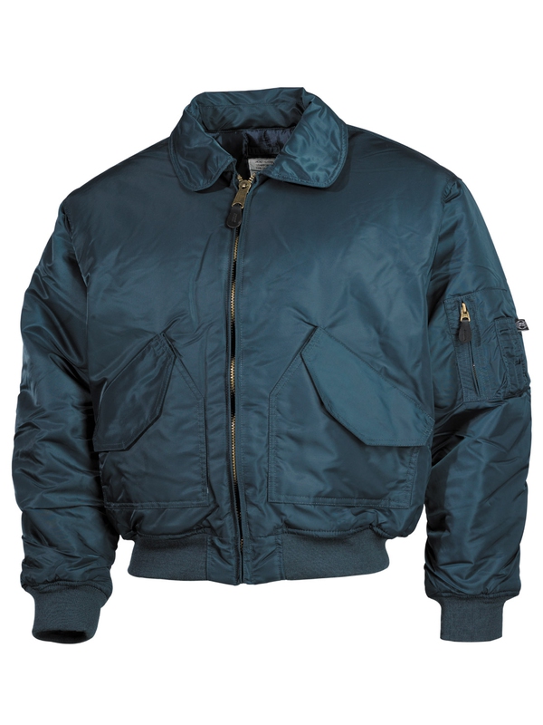 CWU pilotní bunda v barvě námořnické modři s límcem, má dvě našité kapsy, výložky na suchý zip na ramenou, rukávy a pas do pletené manžety. Materiál: 100% nylon, podšívka: 100% polyester, výplň: 100% polyester.