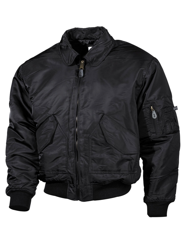 CWU pilotní bunda černá, v nadměrné velikosti, s límcem má dvě našité kapsy, výložky na suchý zip na ramenou, rukávy a pas do pletené manžety. Materiál: 100% nylon, podšívka: 100% polyester, výplň: 100% polyester.