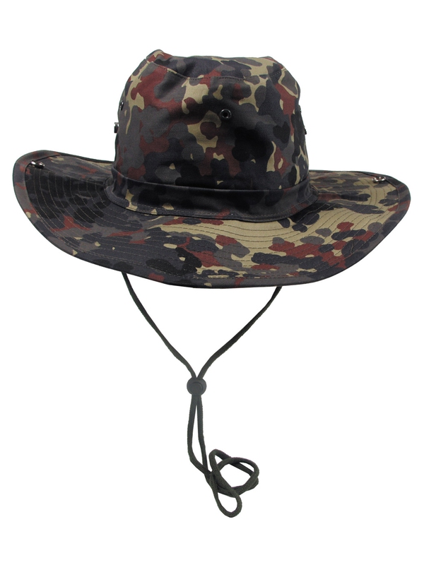 Klobouk v designu flecktarn má šňůrku s uzávěrem na utažení pod bradou. Tropický klobouk má větrací otvory, druky na upravení velikosti krempy, materiál: 65% polyester, 35% bavlna. | ||