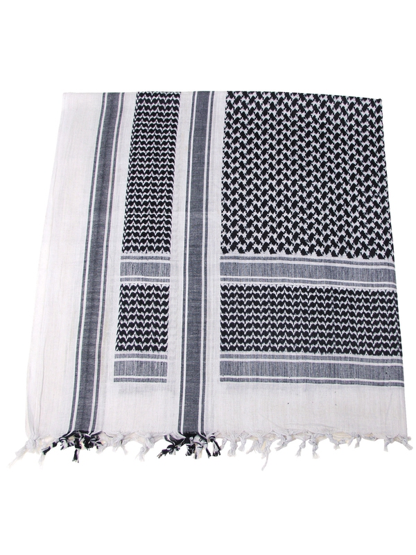 Černobílý šátek s třásněmi. PLO šátek má rozměr 115 x 110 cm a je vyroben ze 100 % bavlny. | ||