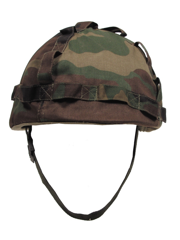 US plastová přilba s textilním maskováním v designu woodland..