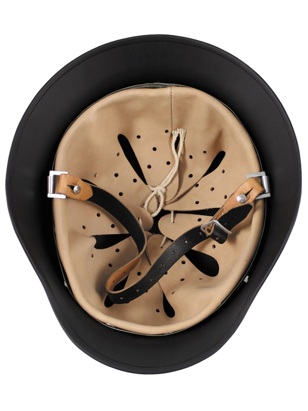 Ocelová přilba WW II, černá, s koženým upínacím řemínkem a částečným vnitřním polstrováním.