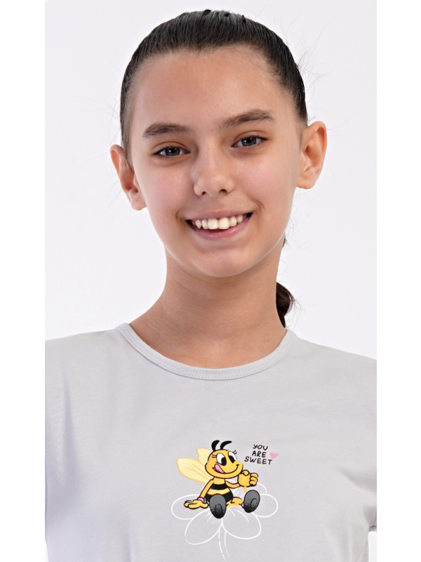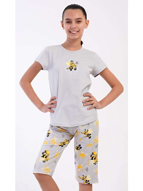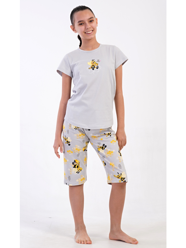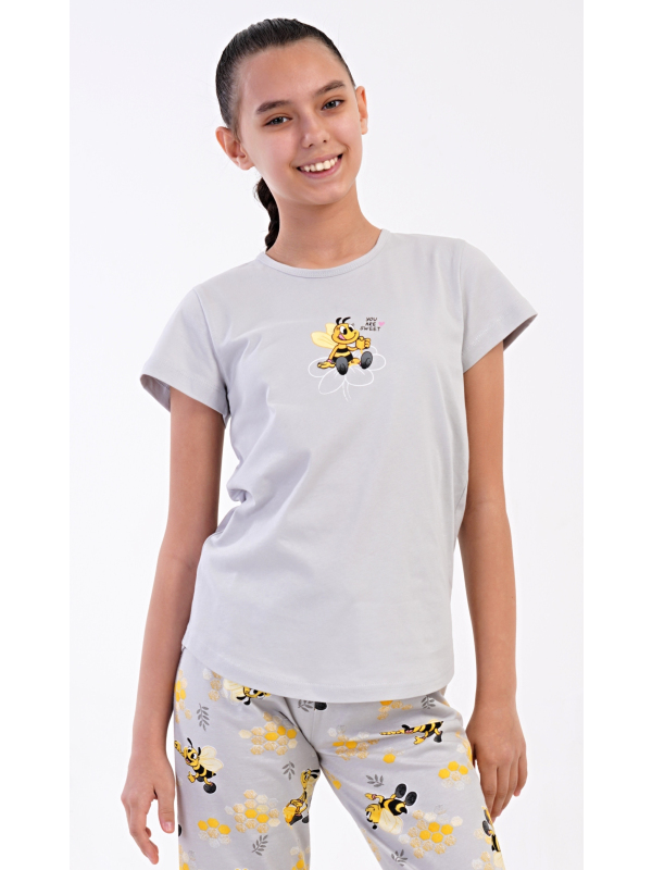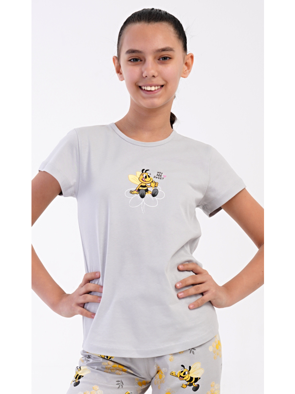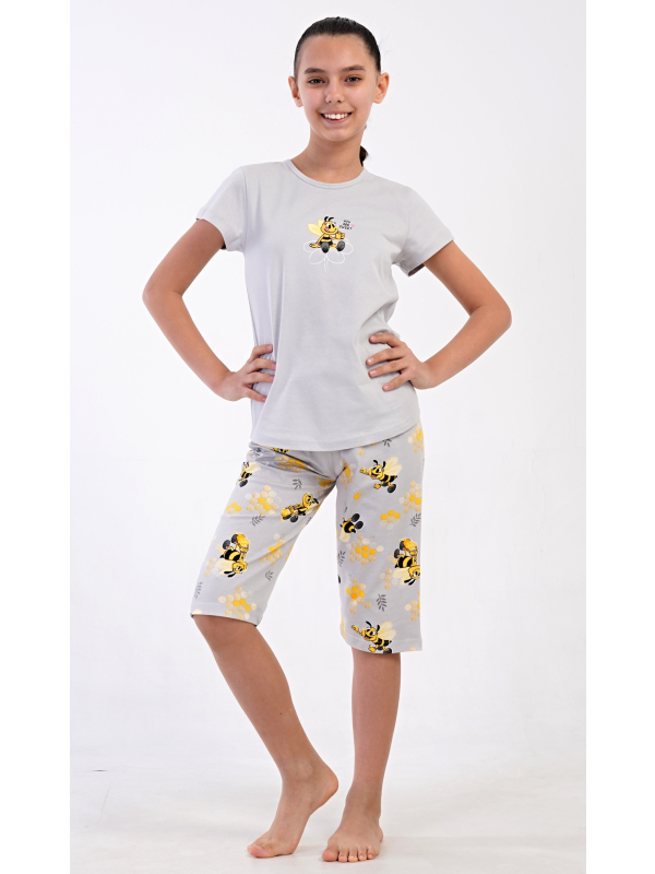 Dětské bavlněné kapri pyžamo Včelky. Dětské pyžamo se skládá z trička s krátkým rukávem a tříčtvrtečních kalhot. Na jednobarevném tričku je obrázek včelky. Tento motiv se opakuje i na kalhotách. Použitý bavlněný materiál je příjemný a poddajný na dotek.