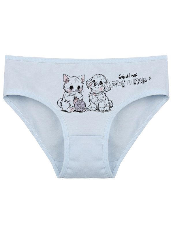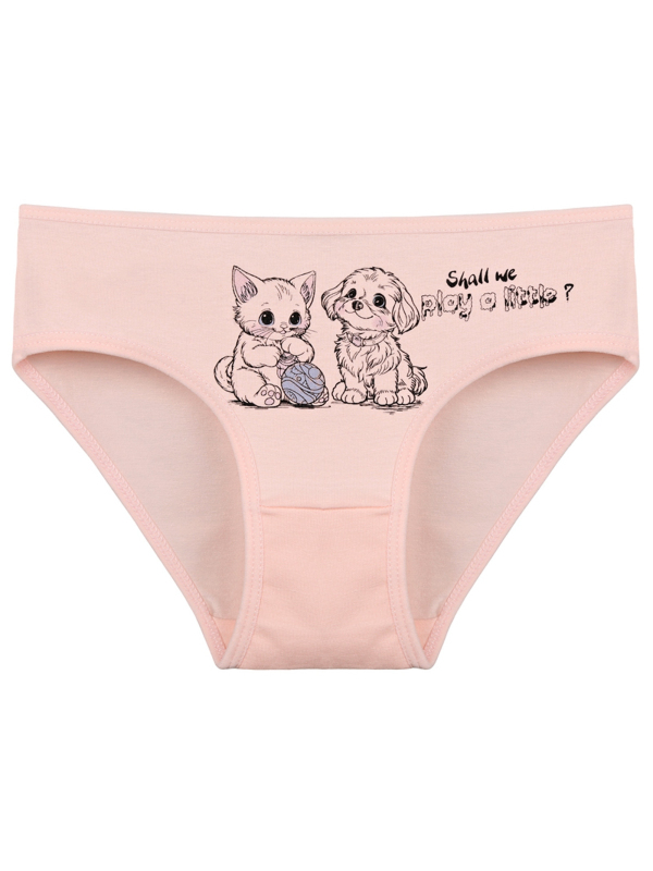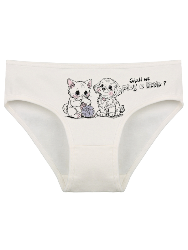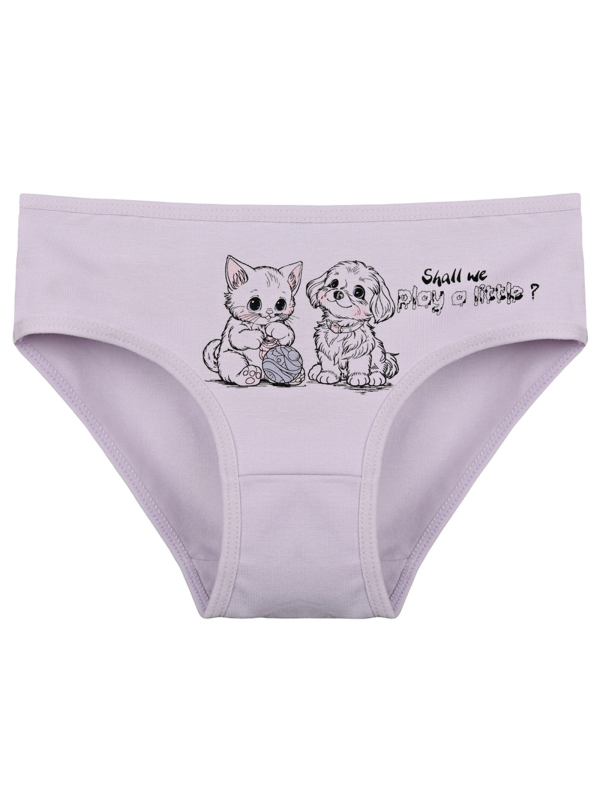 Dětské bavlněné kalhotky Olivia. Dětské kalhotky klasického střihu jsou pohodlné a slušivé, zdobí je obrázek kotěte se štěňátkem. Obzvláště oceníte materiálové složení - 95% bavlna a 5% elasten. Použitý materiál je příjemný a poddajný na dotek.