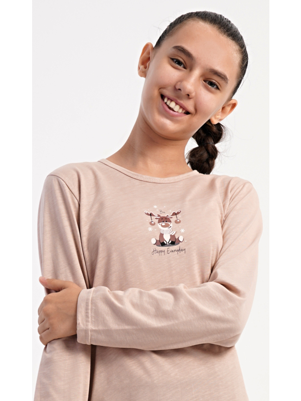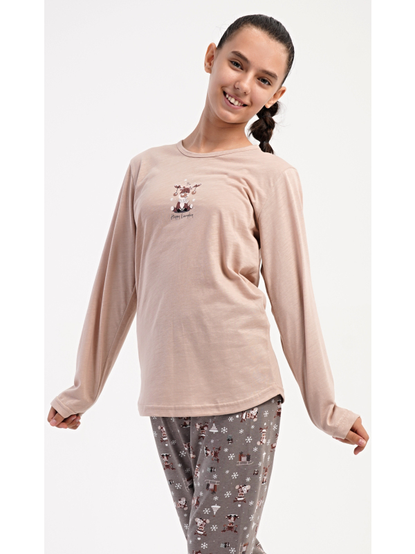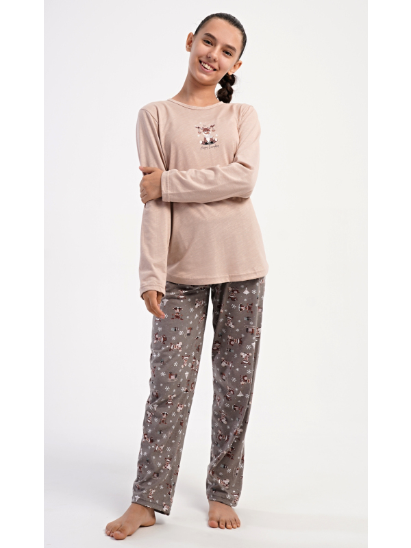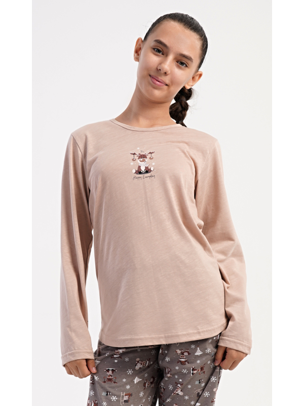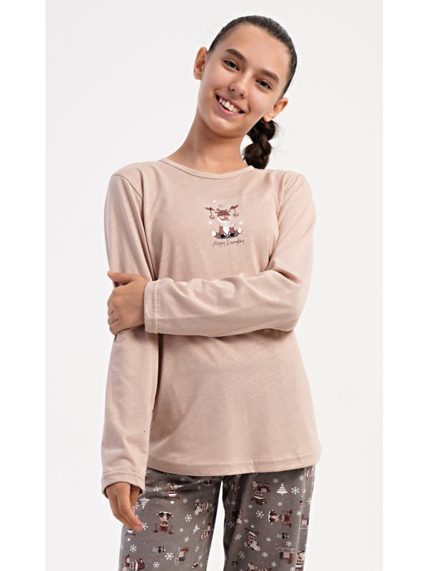 Dětské bavlněné pyžamo s dlouhým rukávem Sobík. Dětské bavlněné dlouhé pyžamo Sobík. Dívčí pyžamo se skládá z trika s dlouhým rukávem a dlouhých kalhot. Triko s kulatým výstřihem je ozdobeno obrázkem malého vánočního soba. Tento motiv se opakuje i na kalhotách, které mají v pase gumu a šňůrku na stažení, nemají kapsy. Použitý bavlněný materiál je poddajný a příjemný na dotek. Pokyny pro údržbu: - 100% bavlna Míry naměřené na výrobku