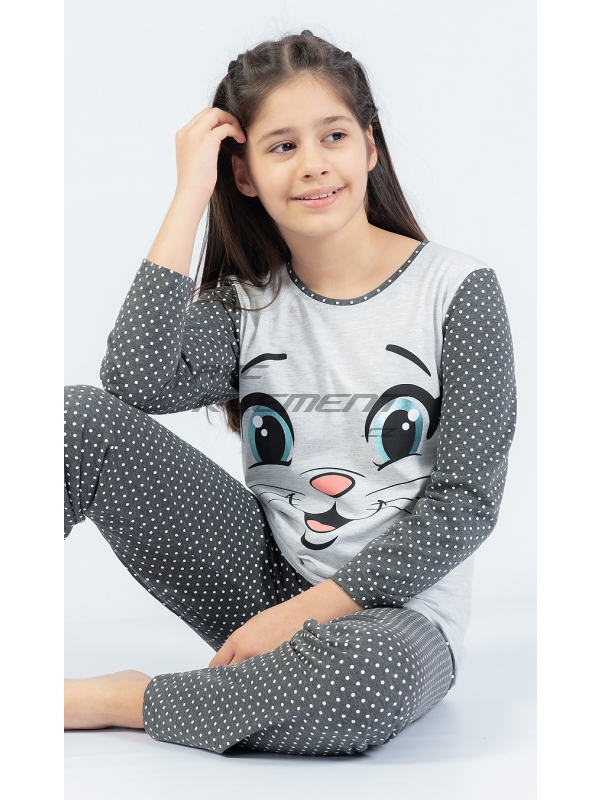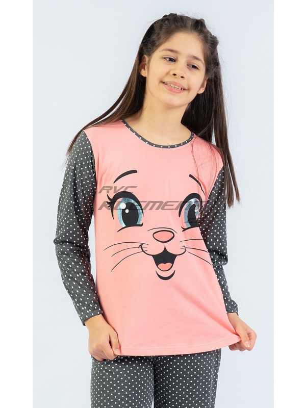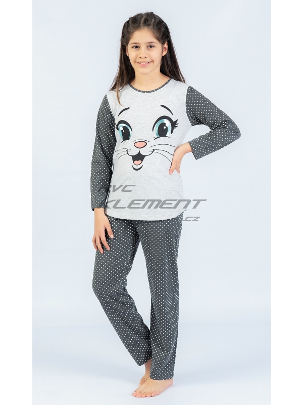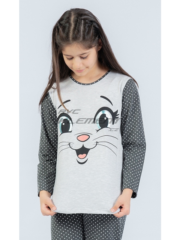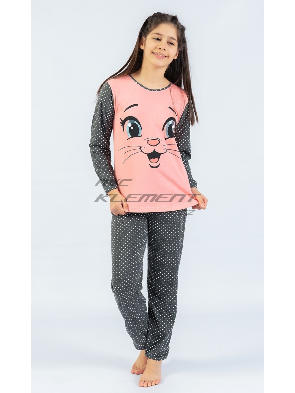 Dětské pyžamo dlouhé Malý miláček. Dětské pyžamo dlouhé Malý miláček. Dětské pyžamo se skládá z trika s dlouhým rukávem a dlouhých kalhot. Jednobarevné triko má barevně odlišené puntíkované rukávy a na hrudi obrázek tváře kočky. Puntíkované kalhoty mají v pase gumu, nemají kapsy. Použitý materiál je příjemný a poddajný na dotek. Lososová varianta: tričko 100% bavlna, rukávy a kalhoty 70% bavlna. Šedá varianta: tričko i kalhoty 70% bavlna. Pokyny pro údržbu: - lososová varianta- tričko 100% bavlna, rukávy a nohavice 70% bavlna,30% polyester - šedá varianta - 100% bavlna