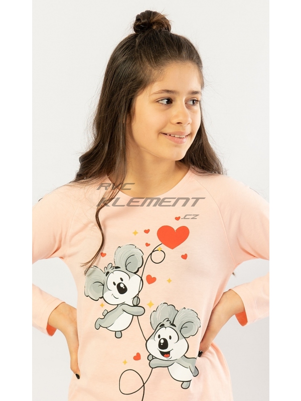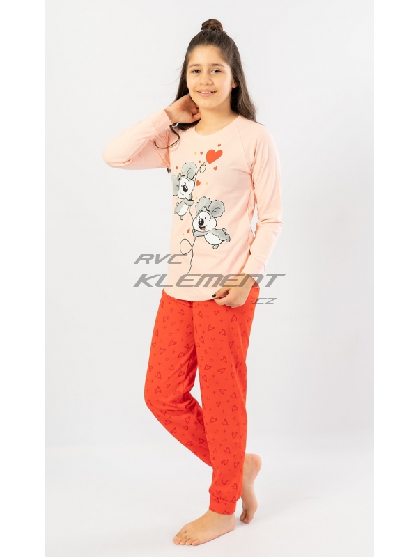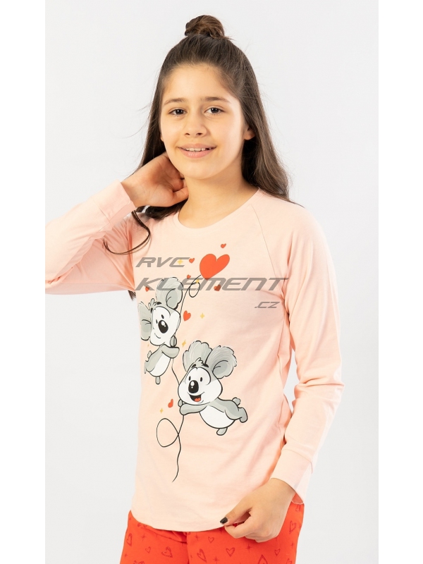Dětské pyžamo dlouhé Koaly. Dětské bavlněné pyžamo dlouhé Koaly. Dětské pyžamo se skládá z trika s dlouhým rukávem a dlouhých kalhot. Na triku je velký obrázek dvou roztomilých koal, které letí na balónku. Koaly obklopují srdíčka a hvězdičky. Motiv srdíček a hvězdiček se opakuje i na dlouhých kalhotách, které jsou zkončeny panty. Kalhoty mají v pase gumu a šňůrku na stažení, nemají kapsy. Použitý bavlněný materiál je příjemný a poddajný na dotek.