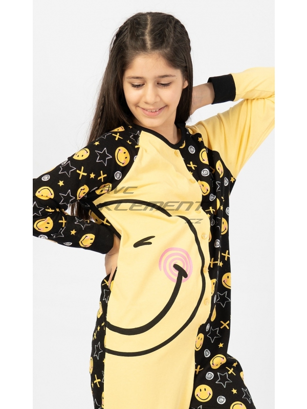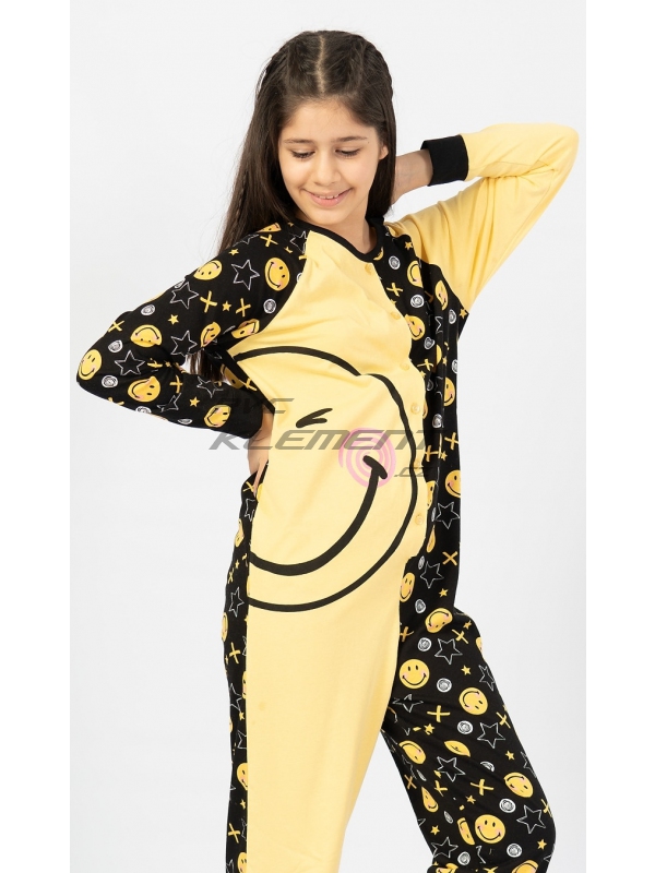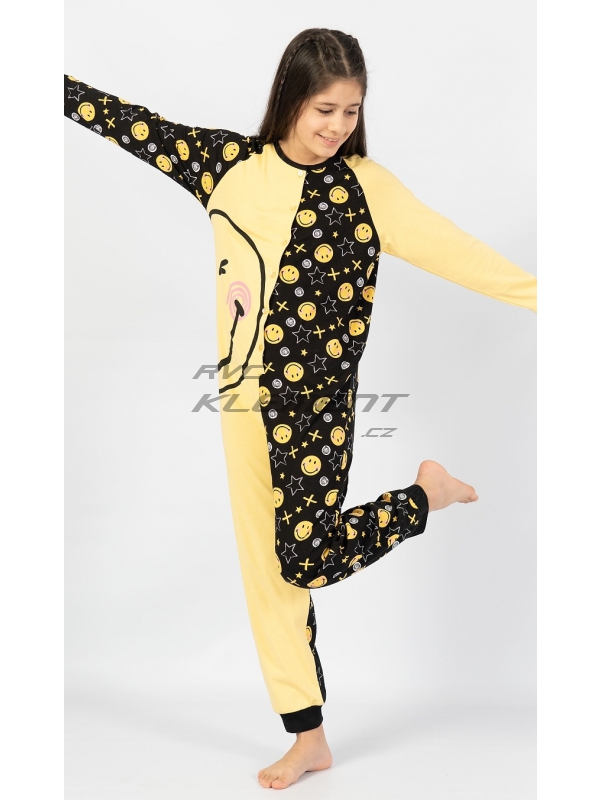 Dětský bavlněný overal Smile. Overal je celopropínací - z jedné strany zdobený velkým obrázkem smajlíka, z druhé strany celoplošným potiskem drobných smajlíků a hvězdiček. Dlouhé nohavice jsou ukončeny elastickými lemy. Bavlněný materiál je poddajný a příjemný na dotek.