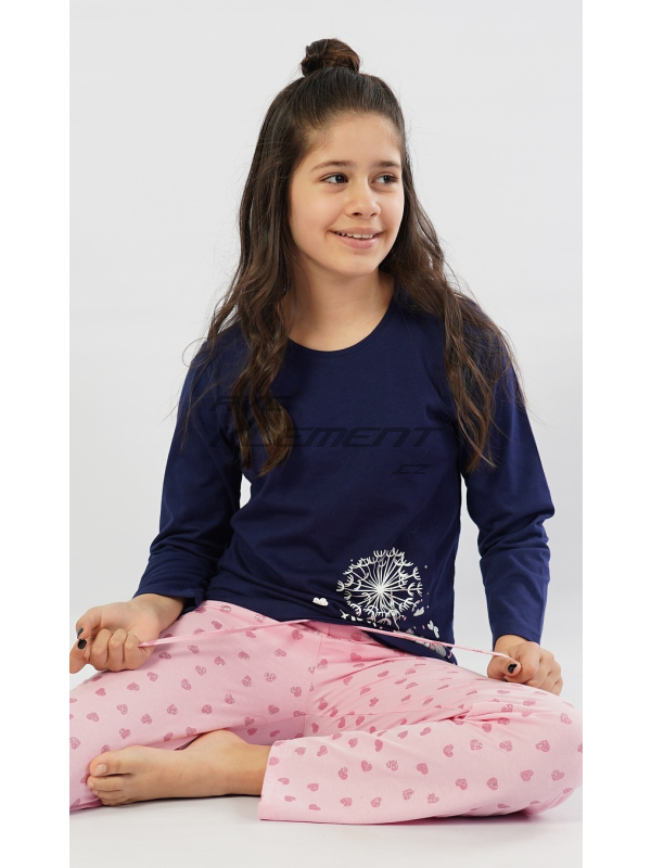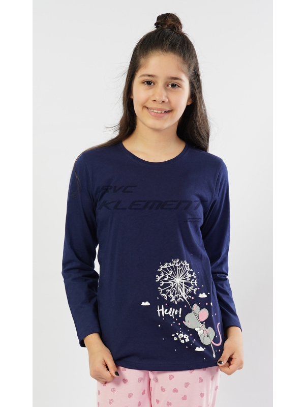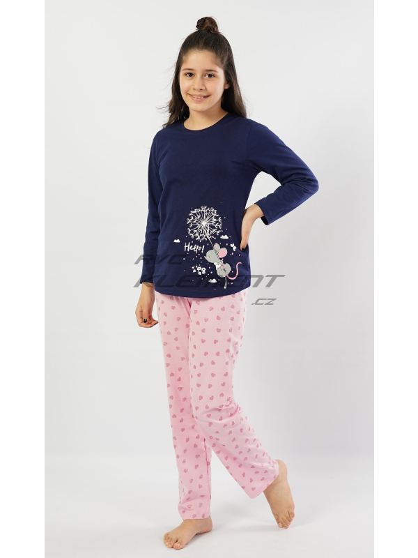 Dětské bavlněné pyžamo dlouhé Myš s pampeliškou. Dětské bavlněné pyžamo dlouhé Myš s pampeliškou. Dětské pyžamo se skládá z dlouhých kalhot a trika s dlouhým rukávem. Na jednobarevném triku je obrázek roztomilé myšky letící na rozfoukané pampelišce mezi obláčky. U myšky je nápis ’Hello’. Růžové dlouhé kalhoty jsou potištěny drobnými lesklými srdíčky. Kalhoty mají v pase gumu a šňůrku na stažení, nemají kapsy. Použitý bavlněný materiál je příjemný a poddajný na dotek.