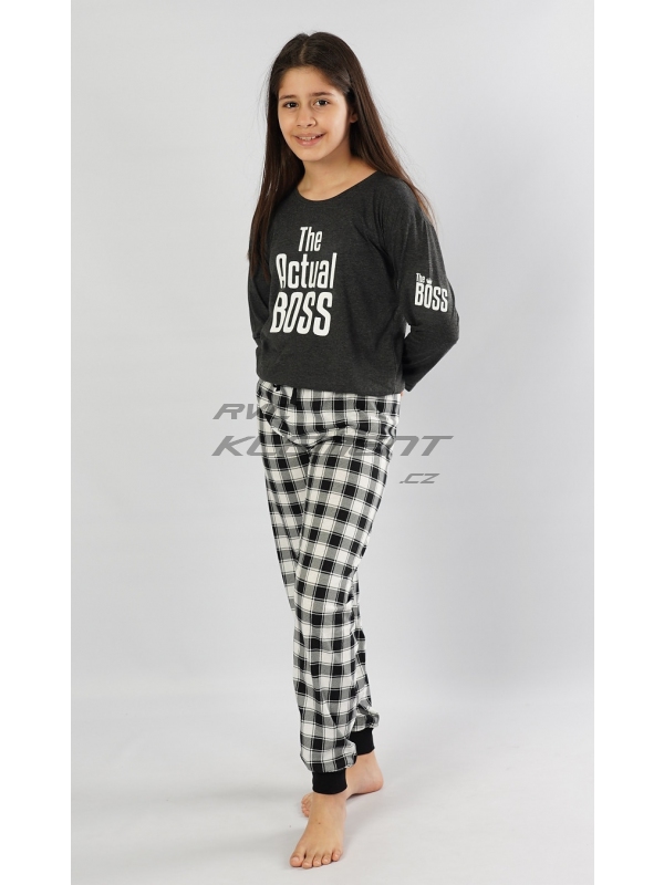 Dětské pyžamo dlouhé Actual boss - dívčí. Dětské pyžamo se skládá z trika s dlouhým rukávem a dlouhých kalhot. Na triku je velký nápis Actual boss, který se opakuje i na rukávu. Triko doplňují kostkované kalhoty, které jsou zakončeny černými panty. Kalhoty mají v pase gumu a šňůrku na stažení, nemají kapsy. Použitý materiál je příjemný a poddajný na dotek. Obsah bavlny u kalhot je 100% a u trika 70%.