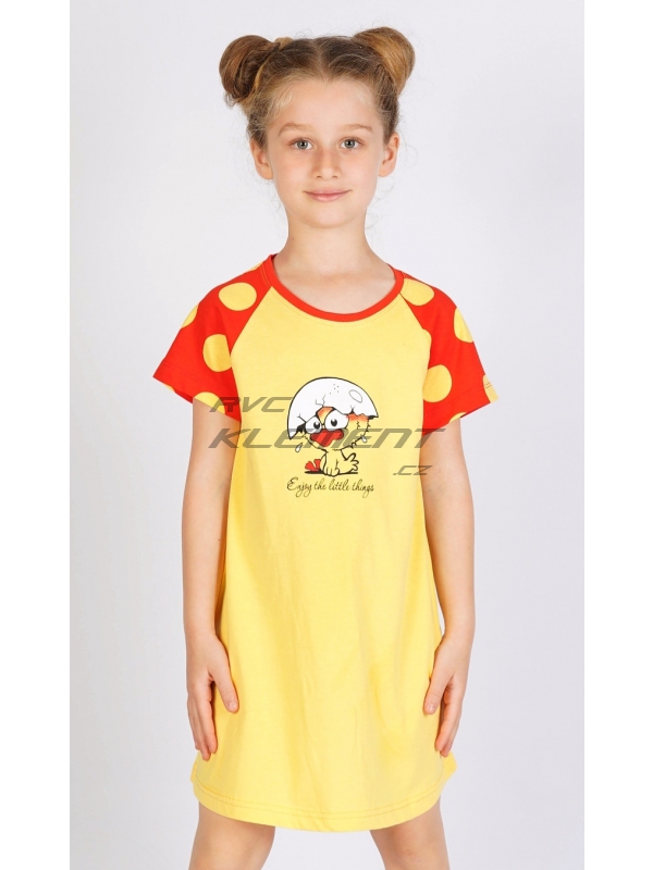 Dětská bavlněná noční košile s krátkým rukávem Malé kuře. Noční košilka má raglánové rukávky s velkými barevnými puntíky, na jednobarevném podkladu Na košilce je obrázek roztomilého kuřátka se skořápkou na hlavě, pod kterým je nápis ’Enjoy the little things’.