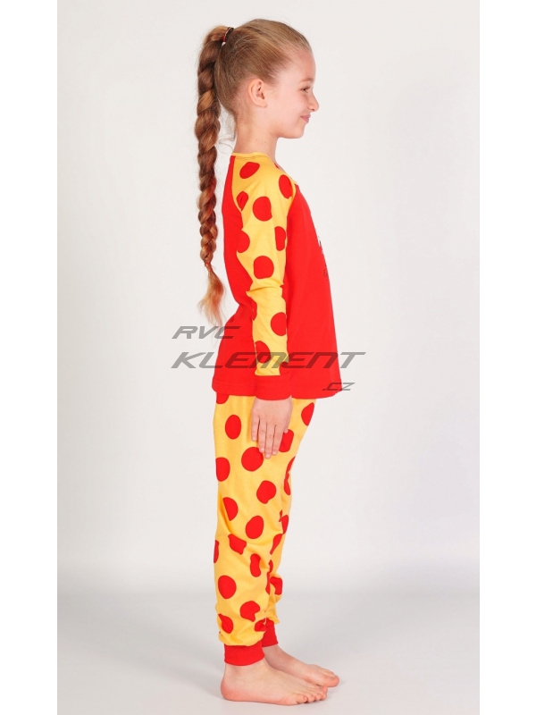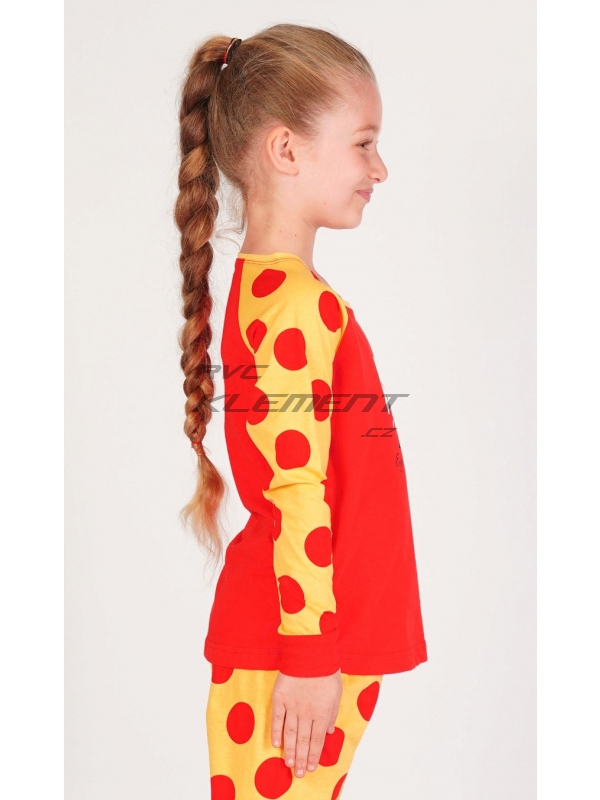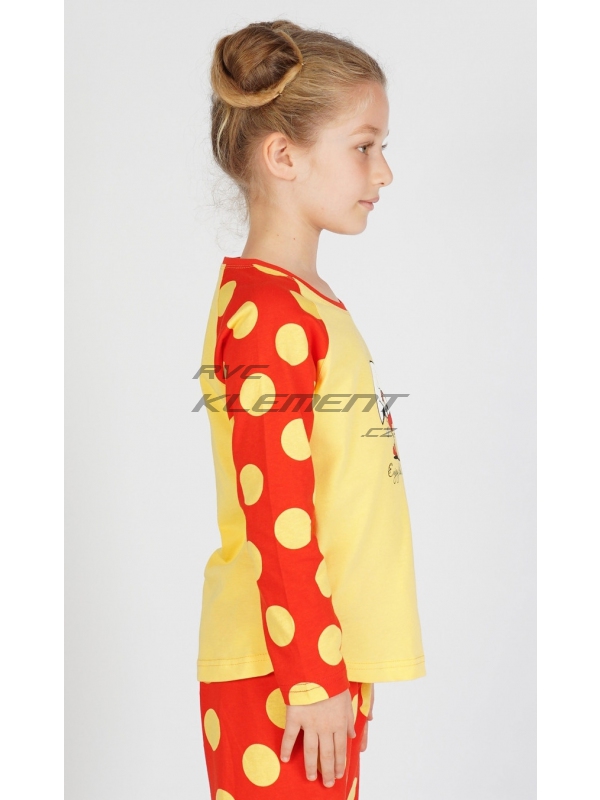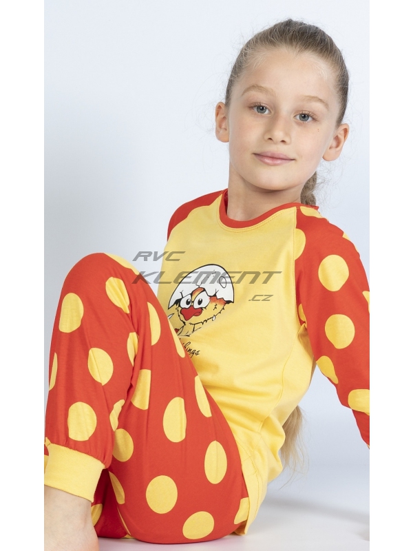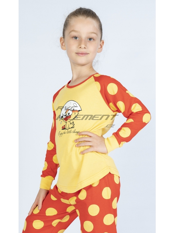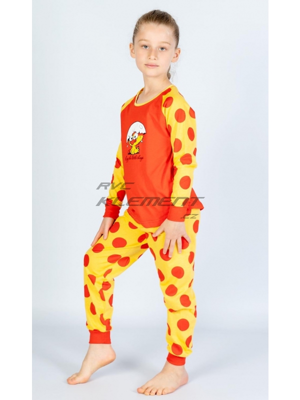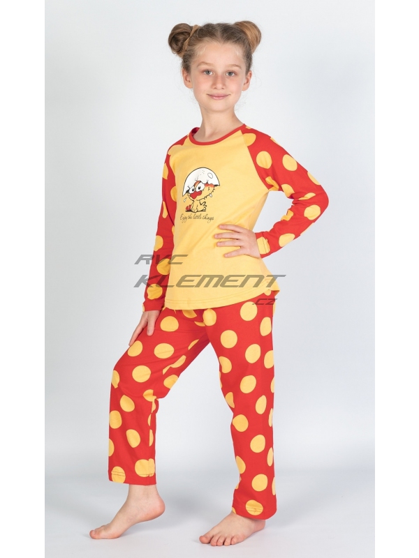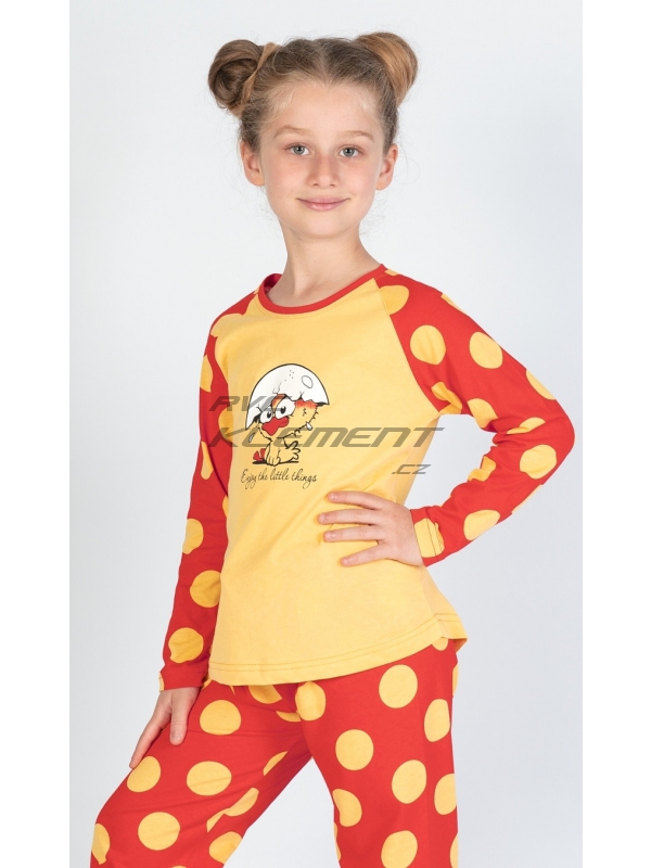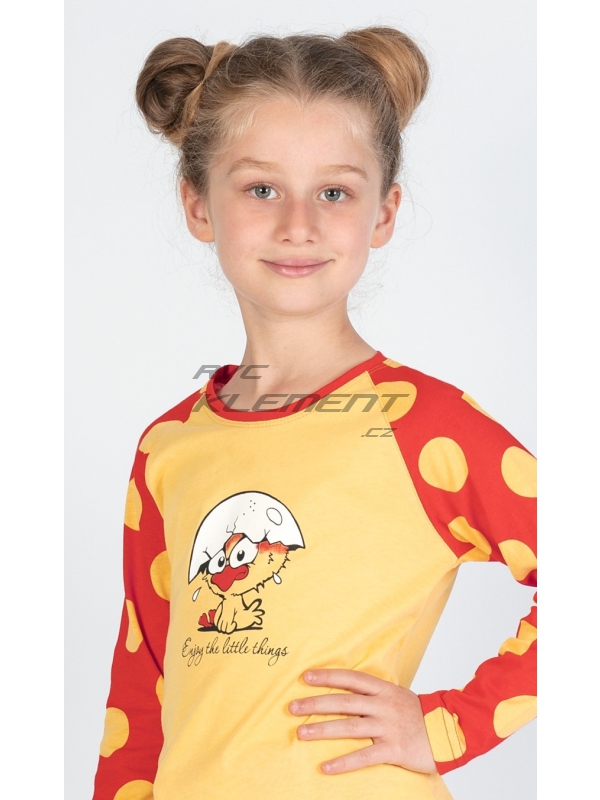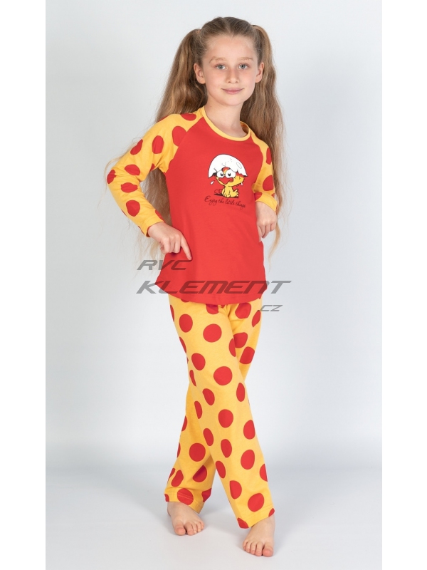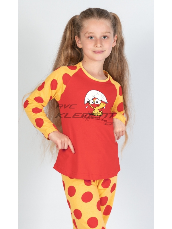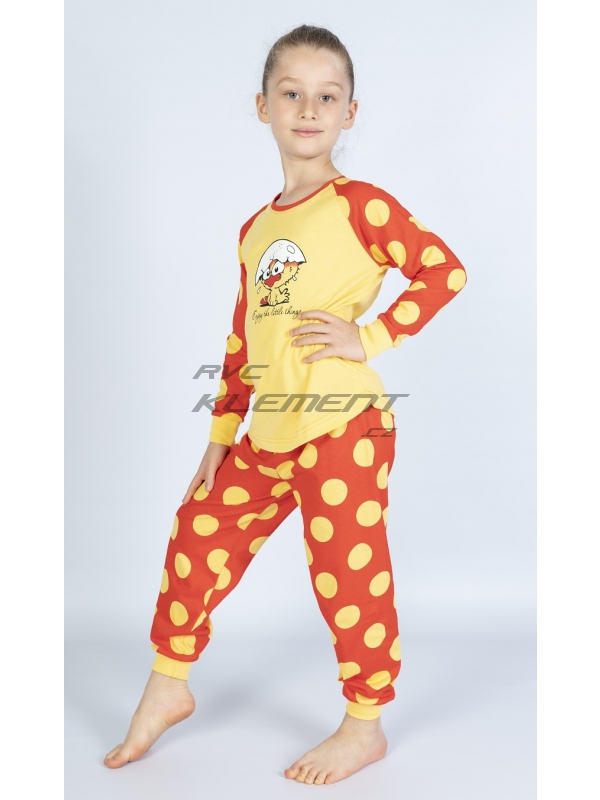 Dětské bavlněné pyžamo dlouhé Kuře. Dětské bavlněné pyžamo dlouhé Malé kuře. Pyžamo se skládá z trička s dlouhým rukávem a dlouhých kalhot. Na tričku je obrázek roztomilého kuřátka se skořápkou na hlavě, pod kterým je nápis Enjoy little things. Tričko má barevně odlišené rukávy, které jsou potištěny velkými puntíky. Puntíky jsou potištěny i dlouhé kalhoty. Použitý bavlněný materiál je příjemný a poddajný na dotek. Pokyny pro údržbu: - 100% bavlna