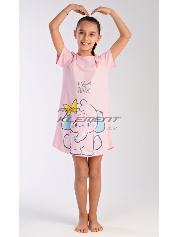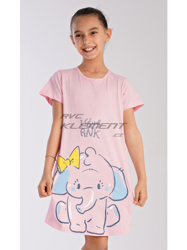 Dětská noční košile s krátkým rukávem Slon. Dětská bavlněná noční košile s krátkým rukávem Slon. Na jednobarevné košilce s krátkým rukávem je obrázek slůněte a nápis ’I believe pink’. Použitý bavlněný materiál je poddajný a jemný na dotek. Pokyny pro údržbu: - 100% bavlna Míry naměřené na výrobku: